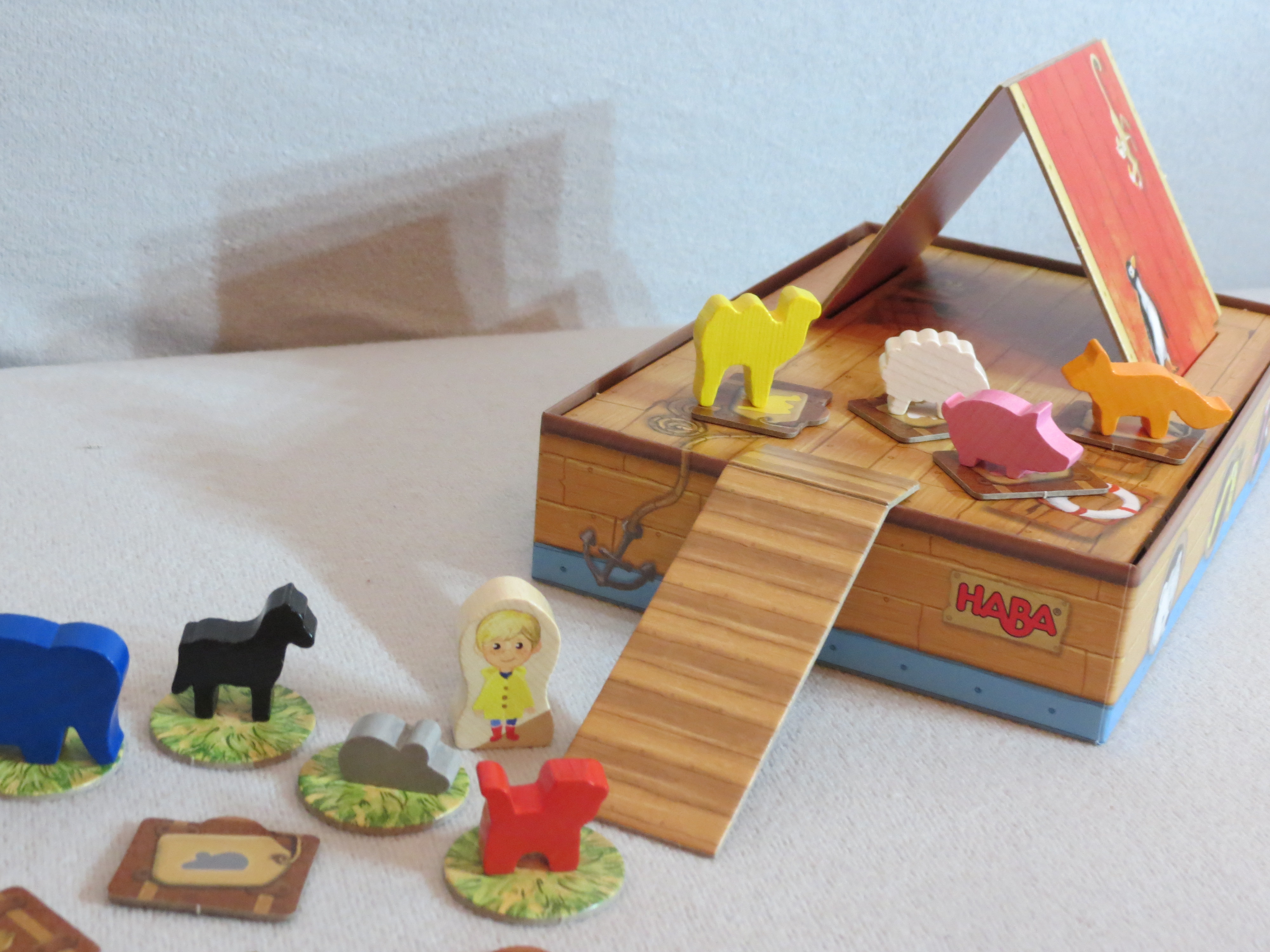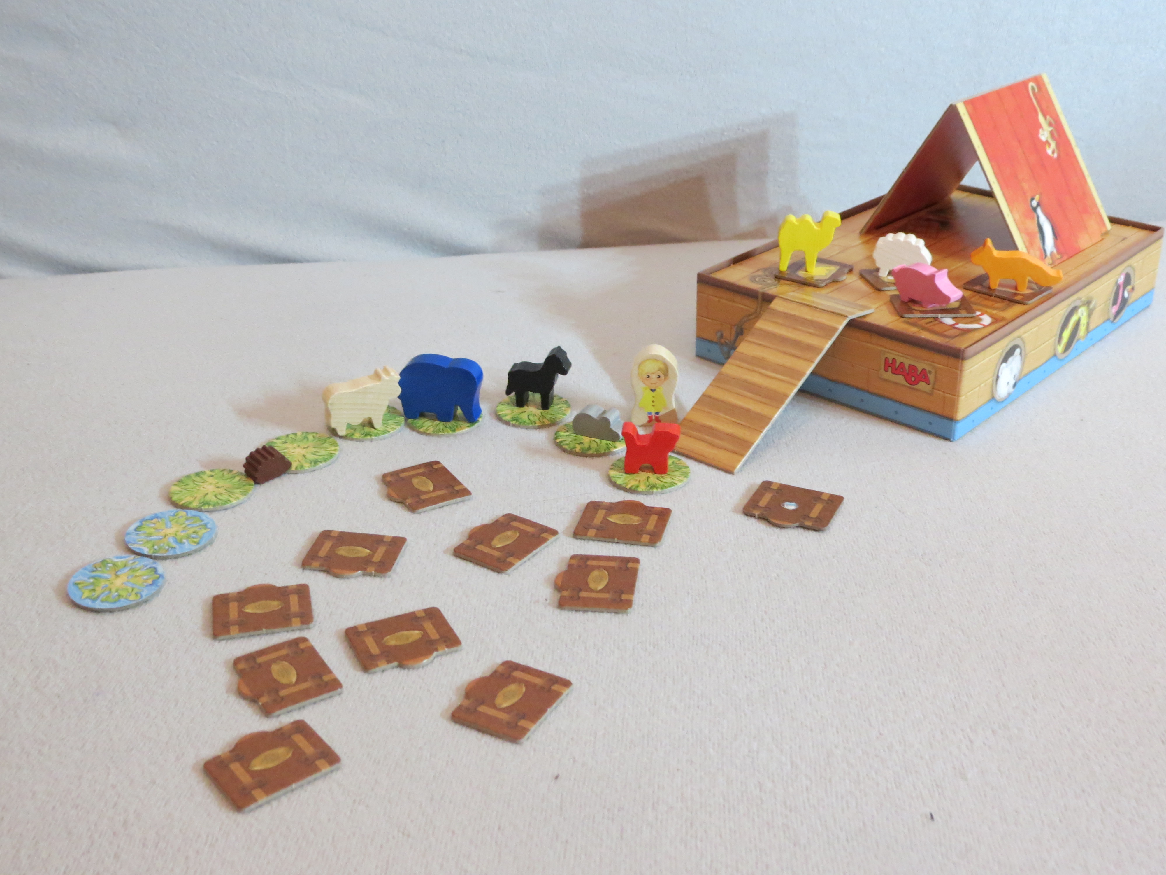 Noahs Arche ist fertig. Es regnet bereits in Strömen. Nun schnell noch die letzten Tiere auf´s Boot. Aber ohne Koffer wollen die Tiere partout nicht einsteigen. Bloss dumm, dass die Koffer noch verdeckt wild durcheinander liegen. Das macht die Zuordnung nicht leicht. Und das Wasser kommt auch immer näher. Schaffen es die Kinder, die Tiere samt ihren Koffern rechtzeitig auf´s Schiff zu bringen. Sich zu merken, welcher Koffer schon mal aufgedeckt wurde, hilft sehr beim Gewinnen:). Es wird kooperativ gespielt. Wer dran ist, stellt Noah neben ein Tier und darf unter einen Koffer sehen. Ist es der Richtige, darf das Tier auf´s Deck klettern. Wenn nicht, muss der Koffer wieder verdeckt werden. Aber wehe, wenn der Koffer Wassertropfen zeigt. Dann kommt das Wasser immer näher. Steht der Weg komplett unter Wasser, verlieren die Kinder gemeinsam.